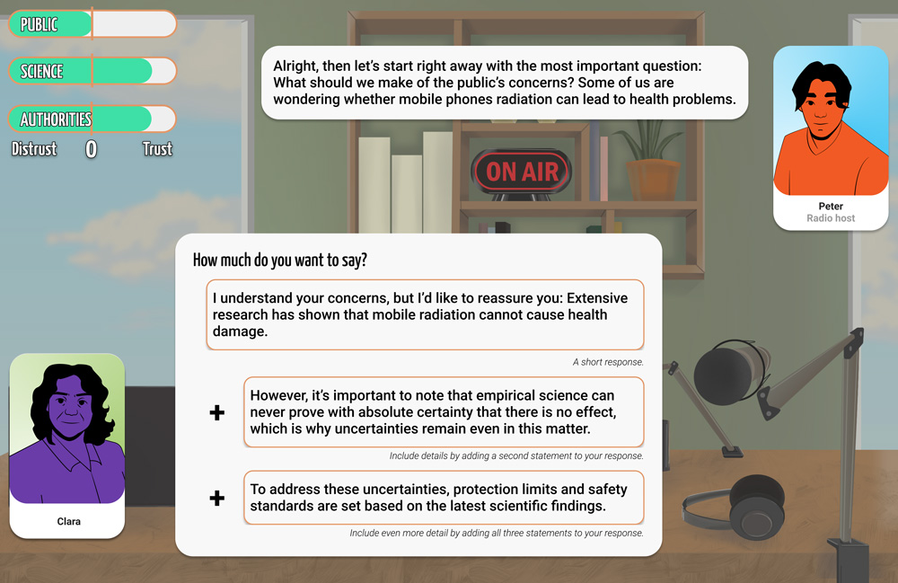 This is where the idea for the game came from: it aims to contribute to understanding between science and the public by making this dilemma of science communication tangible. As game developers, we hope that “Talk Science” will encourage people to reflect on their expectations towards science communication. The aim is deliberately not to lecture players, but simply to enable them to experience why science communication is a difficult process in which it is impossible to satisfy all parties involved.